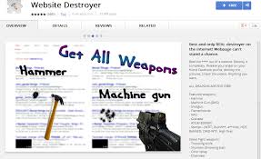 اليوم احضرت لكم اضافة جميلة لجوجل كروم للخروج من جو الملل اسمها Website Destroyer , هذه الاضافة عبارة عن لعبة تمكنك من التسلية والترفيه على نفسك بتدمير اي موقع على شبكة الانترنت باستعمال مطرقة او مسدس رشاش بإحداث ثقوب او كسور على شاشتك .
